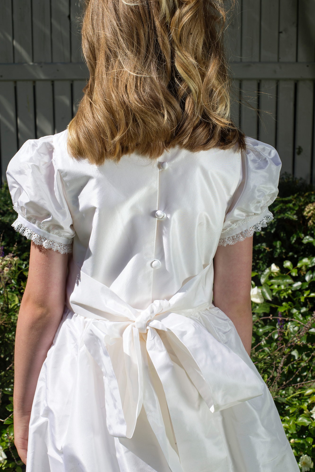 To finish this First Holy Communion dress it ties at the back in a large bow with buttons that are hand finished in silk. This dress is ballerina length and falls just above the ankle. Perfect for a Flower Girls dress or any special ceremonial event.