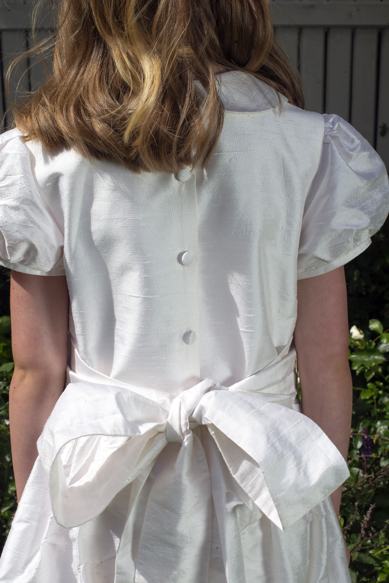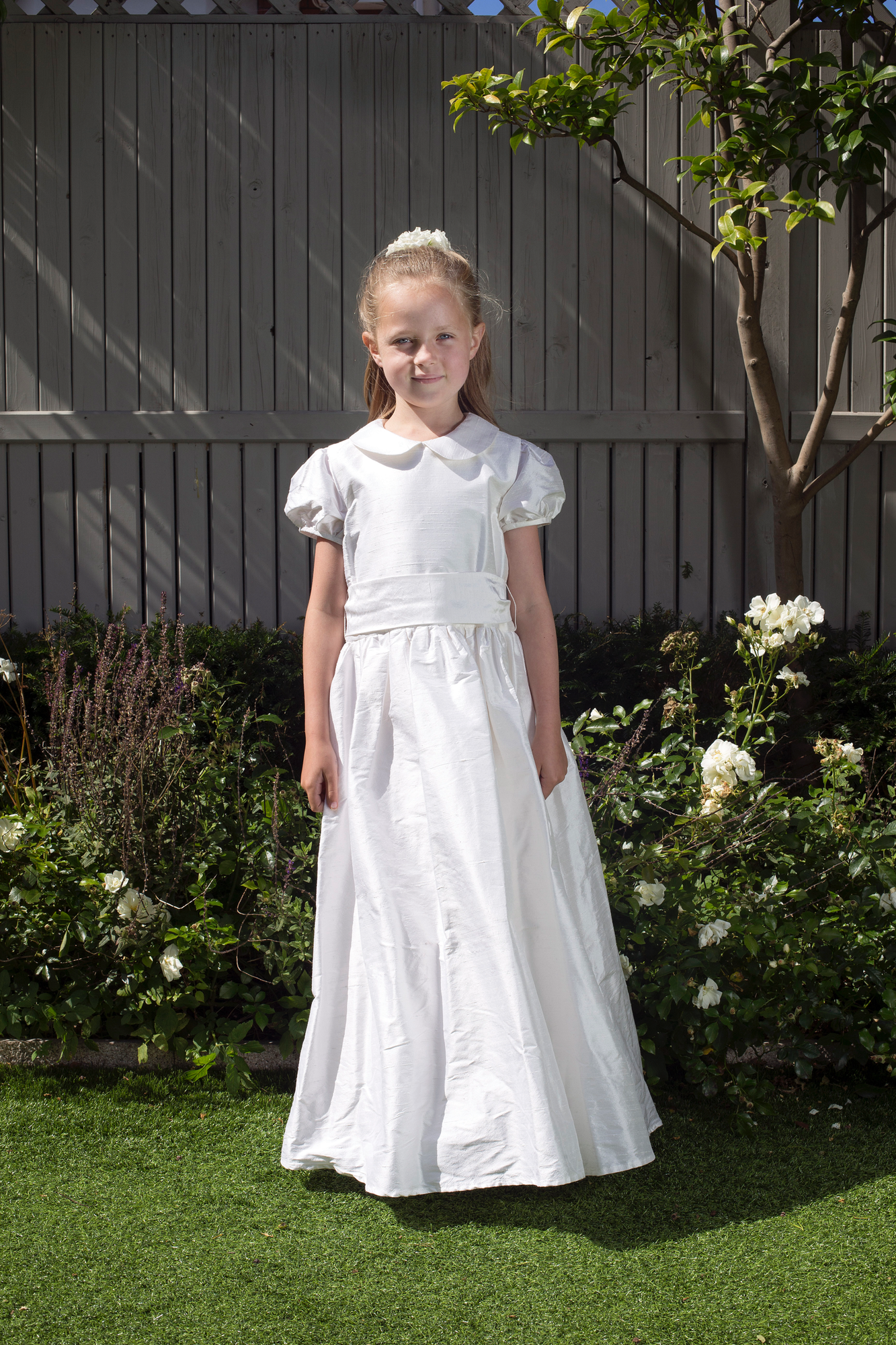 Pre Order. This First Irish Holy Communion silk dress is classic and simple in style. Made from 100% White Silk Dupion with a Peter Pan collar and short puffed sleeves. Each communion dress has an inbuilt petticoat made from the softest cotton to give the dress fullness. To finish this dress it ties at the back in a large bow with buttons that are hand finished in silk. This communion dress is ballerina in length and falls just above the ankle. The Colette dress can also be worn as a Flower Girl dress or for any special ceremonial event with its simple style and short puffed sleeves. View our Styling Suggestions for this outfit.
