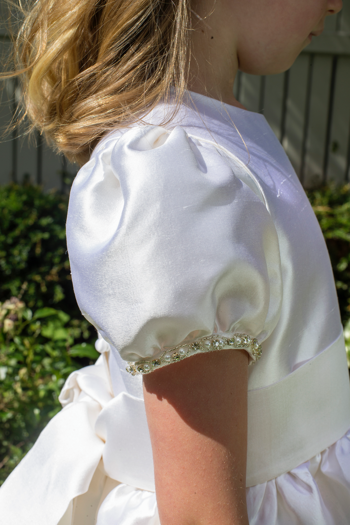Pre Order. This first Holy Communion Irish dress is elegant and simple in design. Made from 100% White Silk Mikado with a high shine finish and short pretty puffed sleeves finished in a diamond and pearl trimming across the arms.
